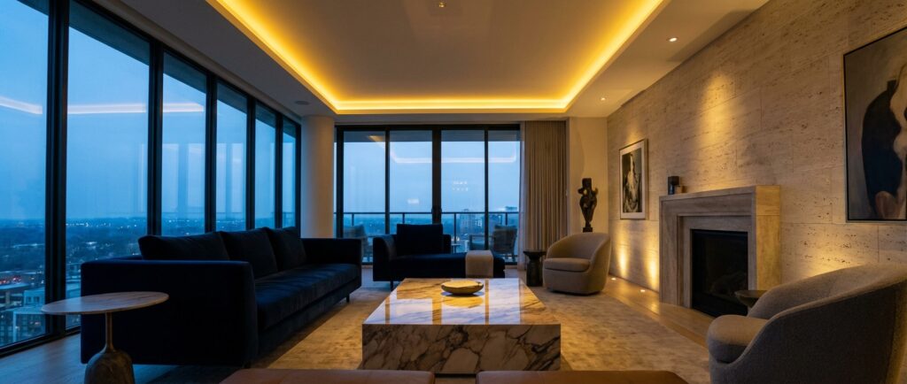 Private residences demand layered lighting strategies that adapt to varying activities and moods. Our residential projects integrate innovative dimming systems with architectural lighting—cove installations, recessed linear LED channels, and concealed uplighting—to create five distinct evening ambiance profiles per room.