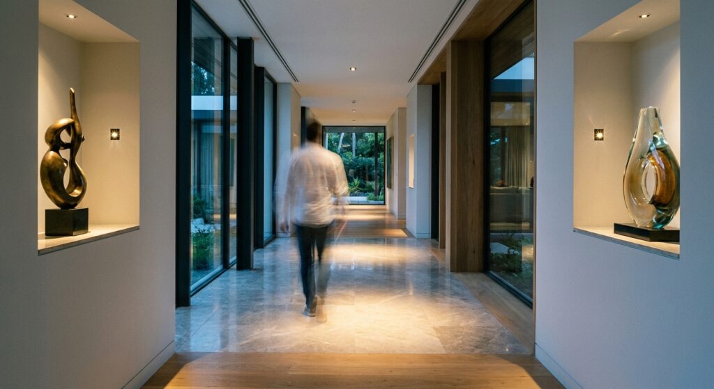 Instead of “Scene 3: 40% brightness, 2800K,” clients select “Evening Reading” or “Dinner Party.” Behind these simple labels, our programming coordinates 15-30 individual fixtures with precise dimming curves and color temperature shifts.