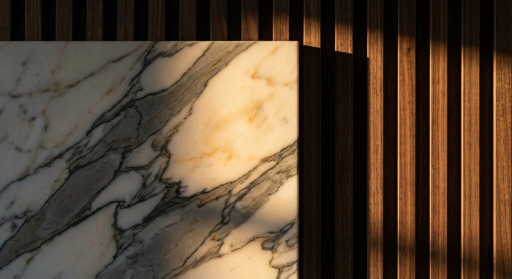 Stone selections emphasize translucent or semi-translucent varieties: backlit onyx panels, Calacatta marble with prominent veining that creates natural shadow patterns, and honed limestone that develops subtle luminosity under grazing light. Metals appear exclusively in warm finishes—aged brass, champagne bronze, rose gold – which reflect 2700K-3000K LED sources without introducing cool color casts.