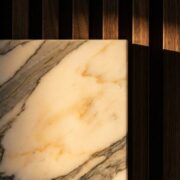 Stone selections emphasize translucent or semi-translucent varieties: backlit onyx panels, Calacatta marble with prominent veining that creates natural shadow patterns, and honed limestone that develops subtle luminosity under grazing light. Metals appear exclusively in warm finishes—aged brass, champagne bronze, rose gold – which reflect 2700K-3000K LED sources without introducing cool color casts.