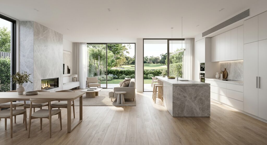 Material selection emphasizes surfaces that respond dynamically to changing light temperatures: polished Calacatta marble that glows under 2700K warm LEDs, brushed brass fixtures that develop depth at twilight, velvet upholstery in jewel tones that shift between emerald and midnight blue depending on illumination angle.